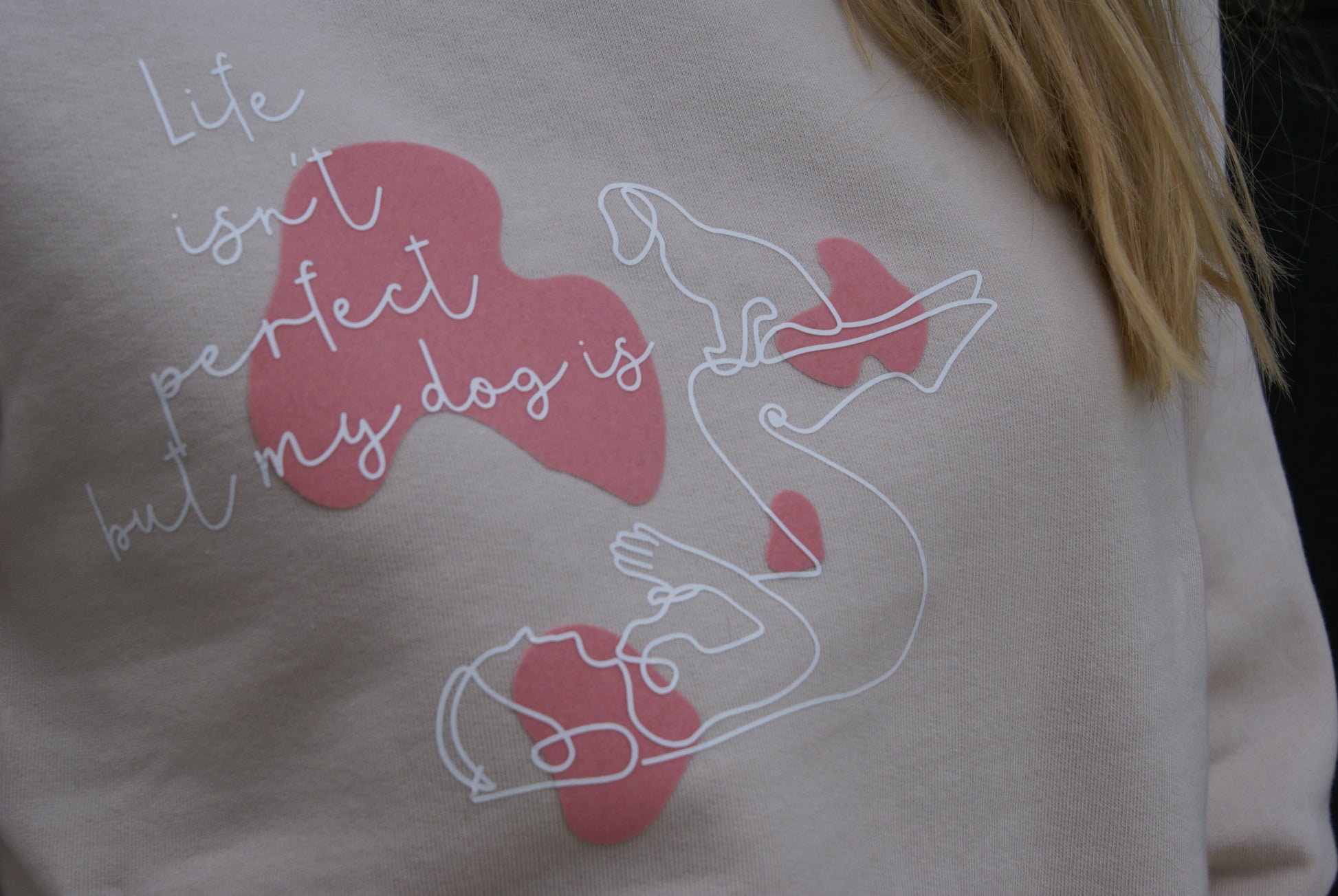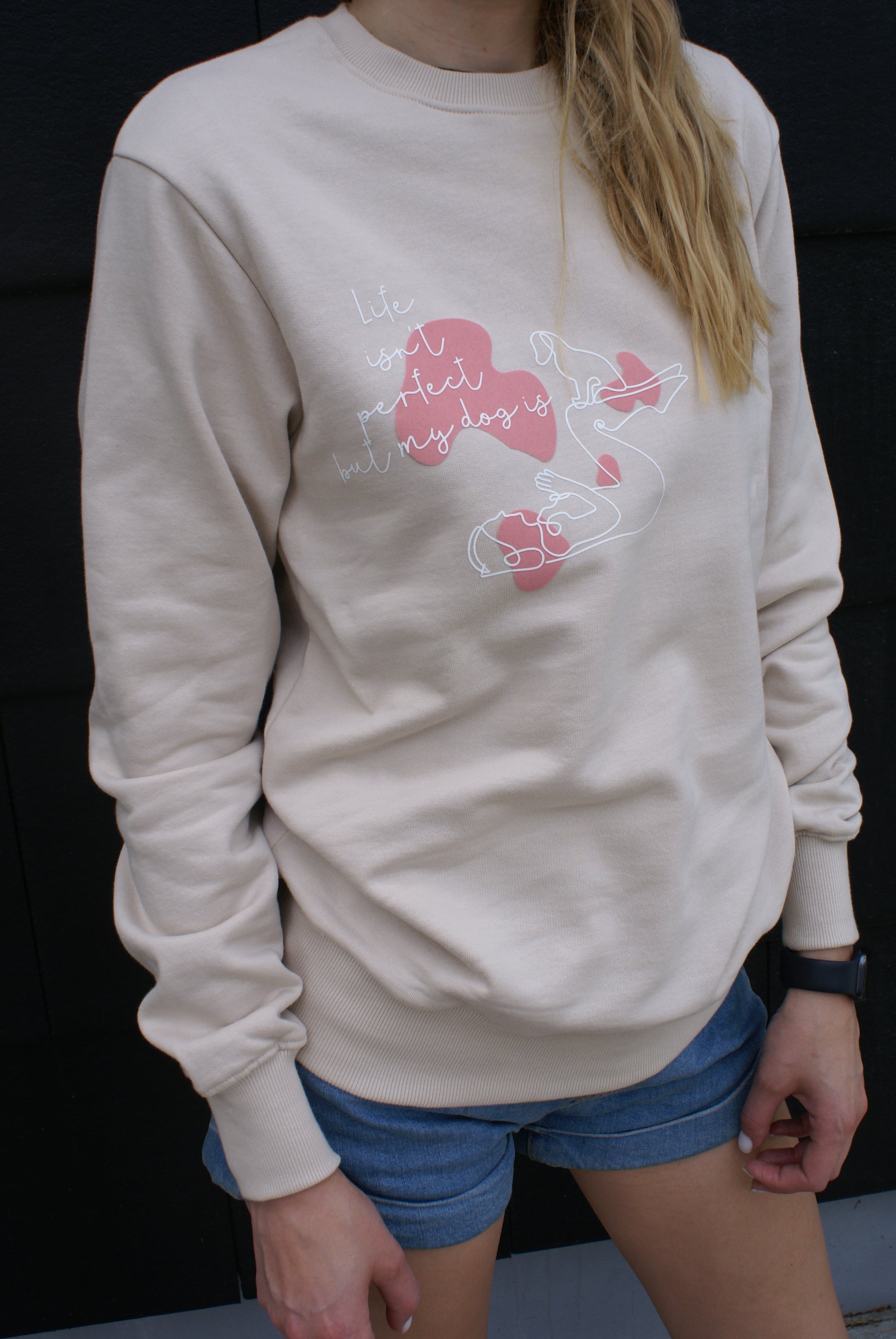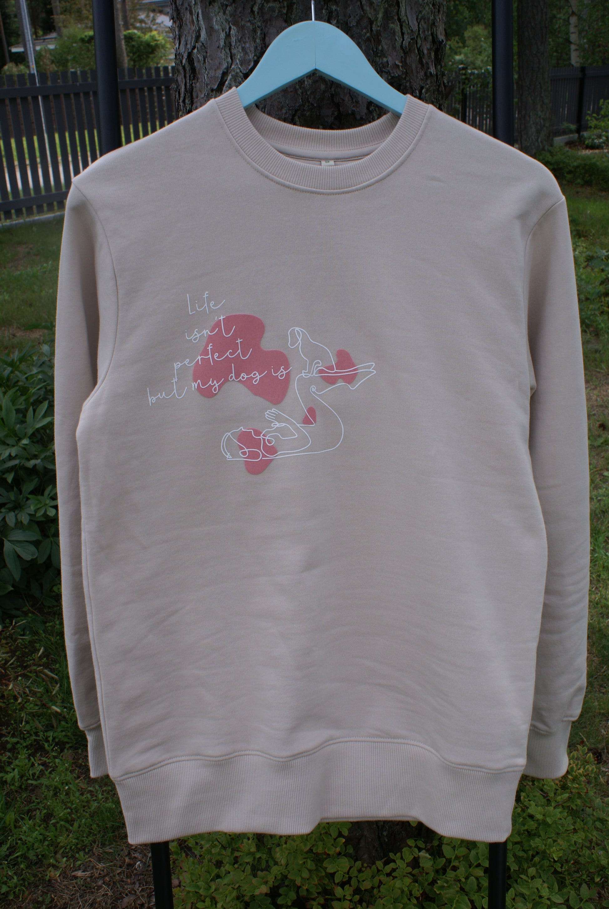 Pusa kirjaga "Life isn't perfect but my dog is". 100% ökoloogilisest (organic cotton) puuvillast valmistatud pusa, millele on käsitööna loodud ning lisatud disain. Valmistatud väikeste partiidena, et tunda end enda pusaga eriliselt!