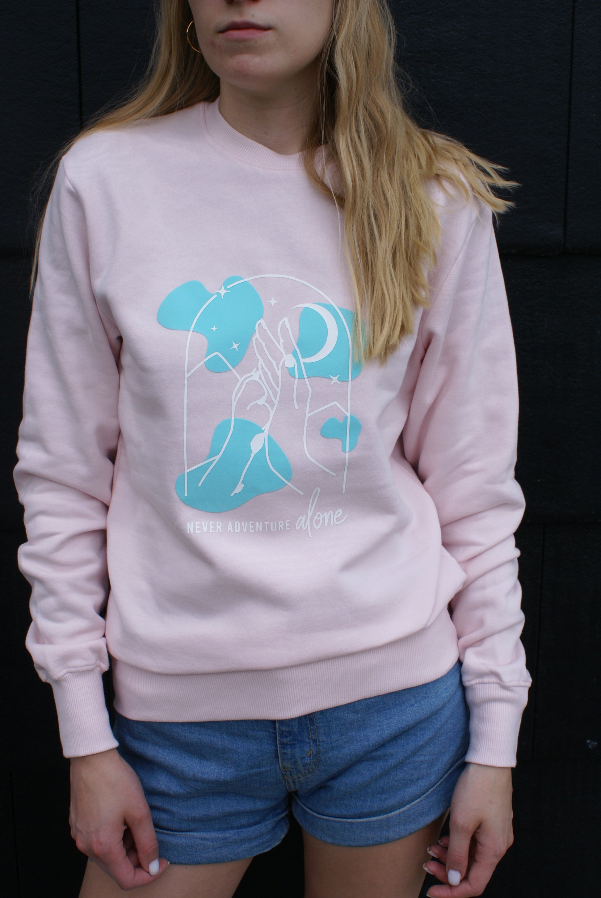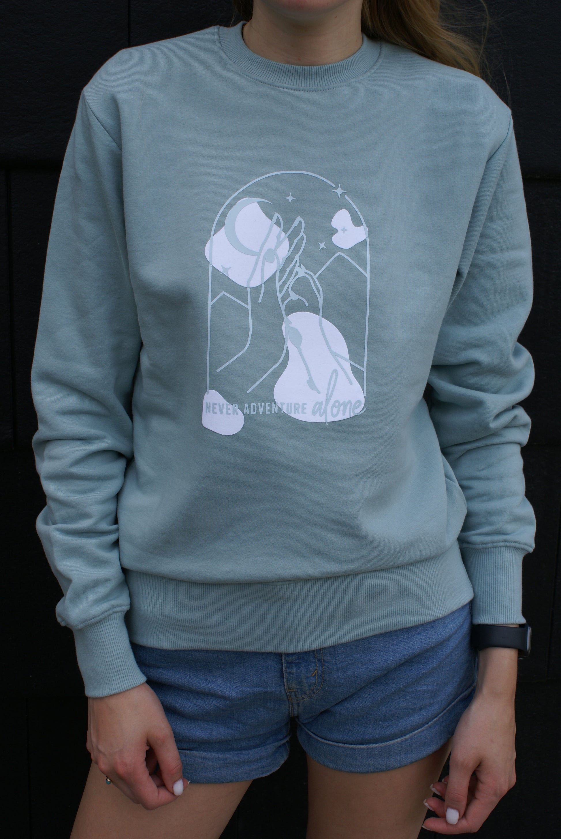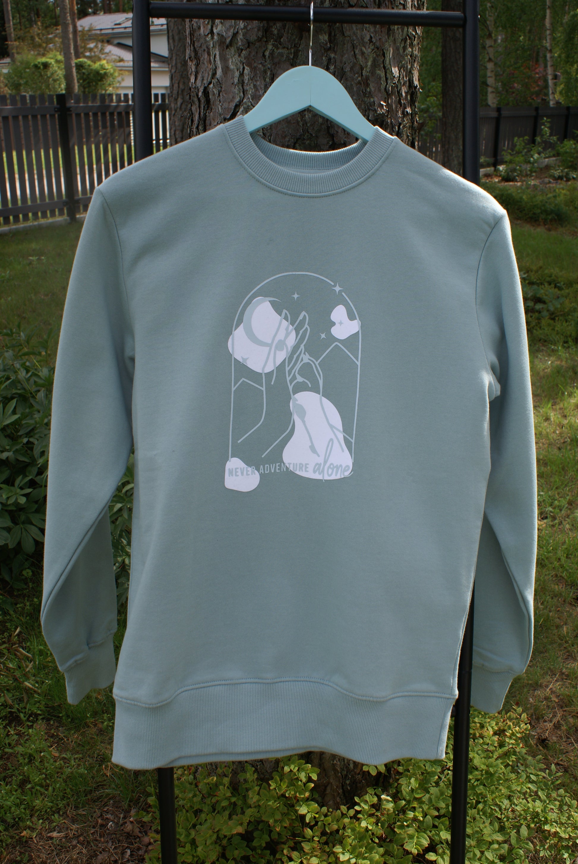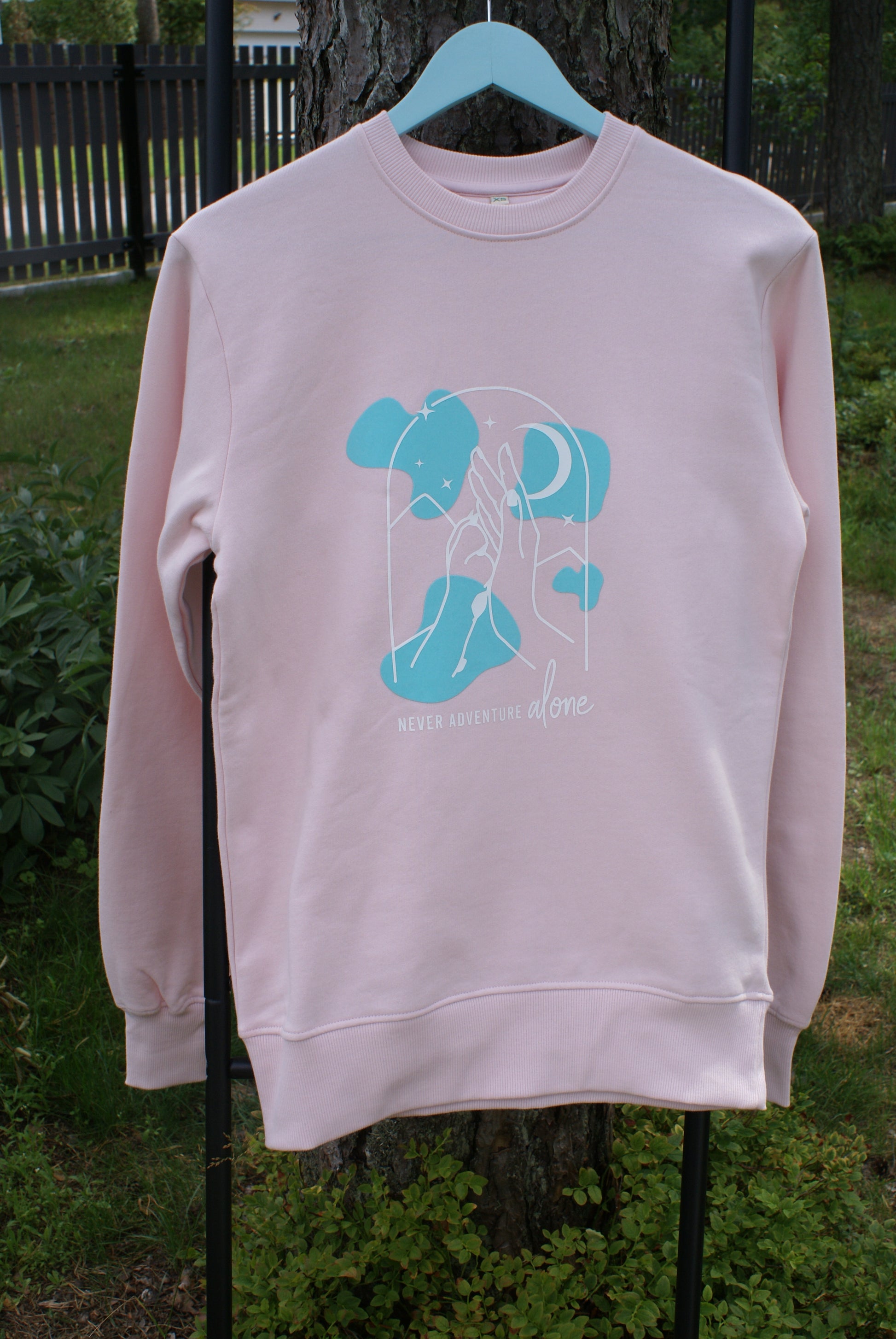 Pusa kirjaga "Never adventure alone". 100% ökoloogilisest (organic cotton) puuvillast valmistatud pusa, millele on käsitööna tehtud ning lisatud disain. Valmistatud väikeste partiidena, et tunda end enda pusaga eriliselt!