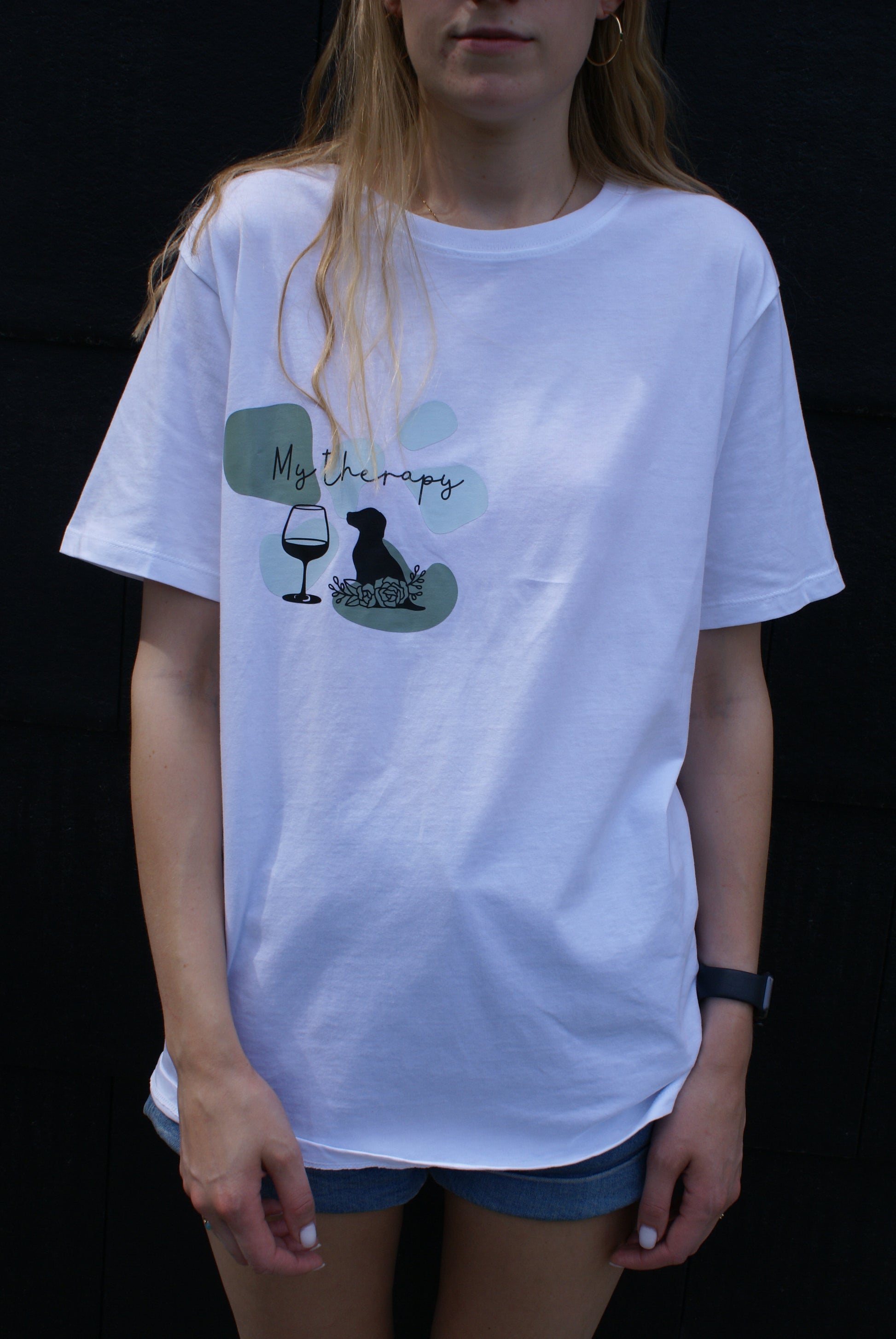 T-särk kirjaga "My dog is my therapy". 100% ökoloogilisest (organic cotton) puuvillast valmistatud t-särk, millele on käsitööna valmistatud ning lisatud disain. Valmistatud väikeste partiidena, et tunda end enda t-särgiga eriliselt!